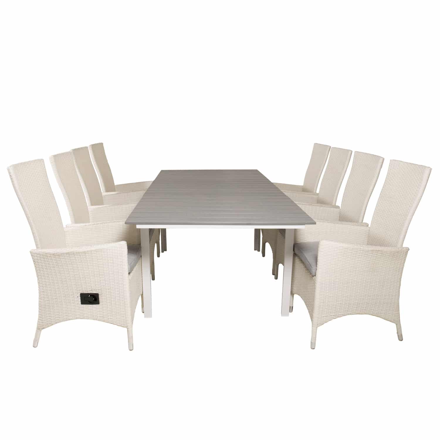 VENTURE DESIGN havesæt m Levels bord m udtræk og 8 Padova stole m recliner -hvid rattan/grå aintwood